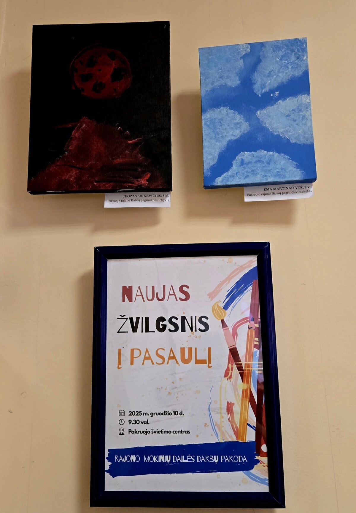 Gruodžio 10 d. Pakruojo švietimo centre atidaryta mokinių dailės darbų paroda „Naujas žvilgsnis į pasaulį“. Joje savo tapybos darbus eksponuoja ir mūsų mokiniai. Parodoje pristatyti penktokės Auros Pagiegalaitės paveikslas „Grybų pasaulis“ ir Juozo Sinkevičiaus darbas „Raudonasis mėnulis“, taip pat aštuntokių Emos Martinaitytės kūrinys „Cukraus vata“, Vakarės Dailidzionokytės paveikslas „Goda – bangų karalienė“ bei Lauros Giedraitytės darbas „Pasaulio kita pusė“. Parodos dalyviai ne tik trumpai papasakojo apie savo kūrinius ir kūrybines idėjas, bet ir aktyviai įsitraukė į kūrybinę veiklą, gavo užduotį iš modelino sukurti fantastinį gyvūną – drakuolmušį. Ši patirtis suteikė daug džiaugsmo, paskatino fantaziją ir leido mokiniams dar kartą į pasaulį pažvelgti nauju, kūrybišku žvilgsniu.