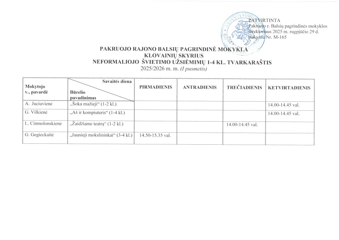 Neformaliojo švietimo užsiėmimų 1–4 kl. tvarkaraštis